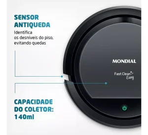 Funcionalidades Avançadas: Este robô aspirador da Mondial possui a função MOP, que permite que ele passe pano enquanto aspira, garantindo uma limpeza completa e eficaz. Além disso, vem equipado com escovas laterais para limpeza de cantos, garantindo que nenhum resíduo seja deixado para trás.